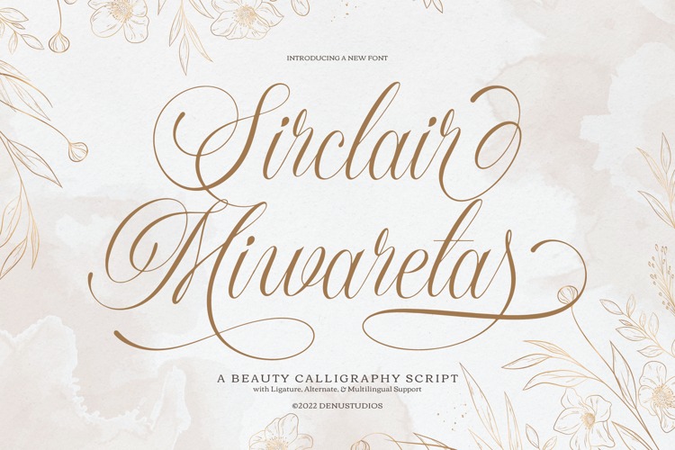 Sirclair Miwareta Font is a stylish typeface that enhances visual appeal and works effortlessly in many design contexts. Sirclair Miwareta | Beauty Calligraphy, from Denustudios, suitable for any projects such as: logos, branding projects, homeware designs, product packaging, mugs, quotes, posters, shopping bags, t-shirts, book covers, name card, invitation cards, greeting cards, label, photography, watermark, special events, and all your other lovely projects that need a Calligraphy taste.