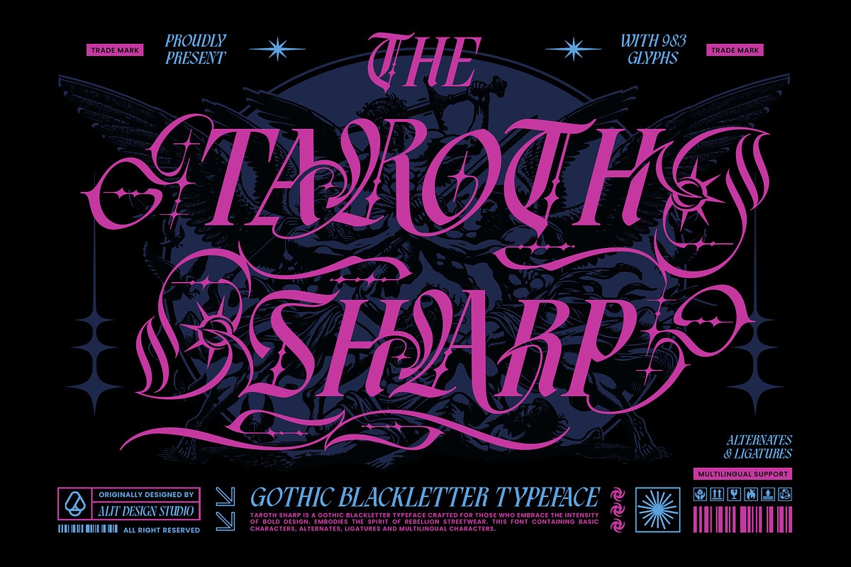 Taroth Sharp Font is a versatile font designed to adapt beautifully across different design styles, offering dependable readability and balance. Taroth Sharp, a meticulously crafted Gothic Blackletter typeface designed for those who dare to stand out. Inspired by the intensity of heavy metal aesthetics and the raw energy of modern streetwear, this font is not just a typeface—it is a visual statement.